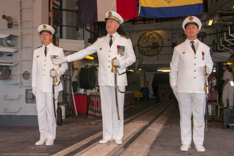 Le capitaine de frégate Denis Camelin s’est vu remettre, quant à lui, les insignes de chevalier de la Légion d’honneur par le contre-amiral Jérôme Régnier.