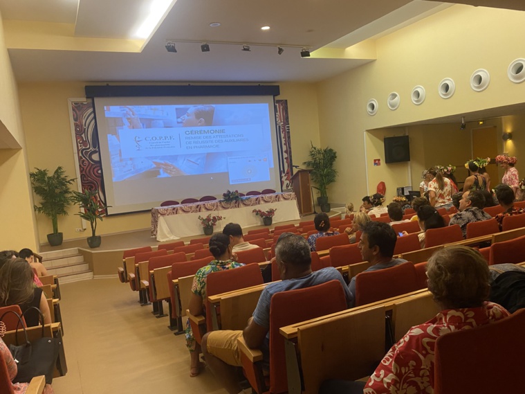 En pharmacie, on retrouve inexorablement des pharmaciens, des préparateurs en pharmacie... et désormais, en Polynésie française, des auxiliaires en pharmacie. Un statut approuvé par la loi du Pays du 23 août 2022, qui permet aux personnes travaillant en pharmacie, sans réel statut mais depuis de nombreuses années, de continuer à exercer et d'avoir enfin un cadre règlementaire et légal dans lequel évoluer. Ce mardi dans l'auditorium du lycée hôtelier de Punaauia ce sont ainsi 120 de ces collaborateurs en pharmacie qui ont reçu, après avoir suivi une formation et des entretiens, une attestation de réussite à la validation des acquis organisée par l'ordre des pharmaciens de Polynésie.