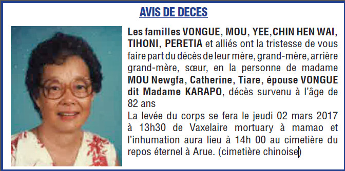 Avis de décès Familles VONGUE, MOU