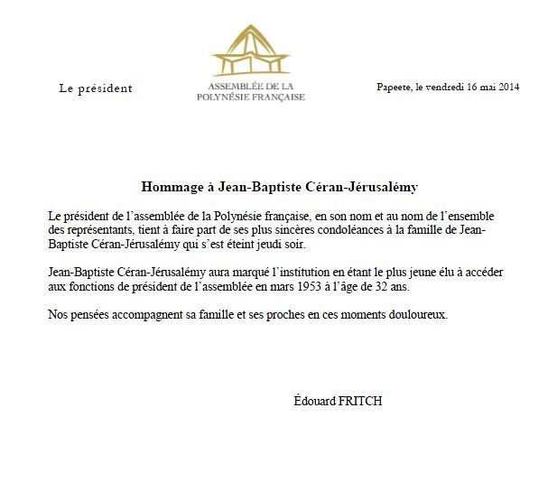 Les familles CERAN-JERUSALEMY, TAUTU, ARCHER, LEHARTEL, HENNEBUISE, COWAN, PETERANO et alliées, ont la douleur de faire part aux parents, amis et connaissances, du décès de Jean-Baptiste CERAN-JERUSALEMY dans sa 93eme année, le jeudi 15 mai 2014 à 19h40.