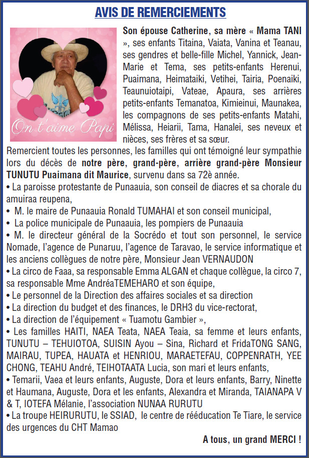 Avis de remerciements Famille TUNUTU