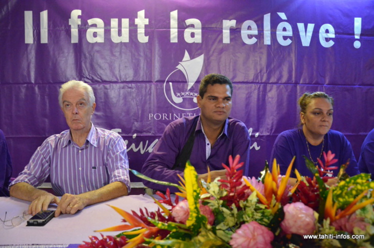 Teiva Manutahi, leader de Porinetia Ora, avec Pierre Marchesini à sa droite, en avril 2013 lors de l'appel au vote Tahoera'a Huira'atira durant l'entre-deux tours des territoriales
