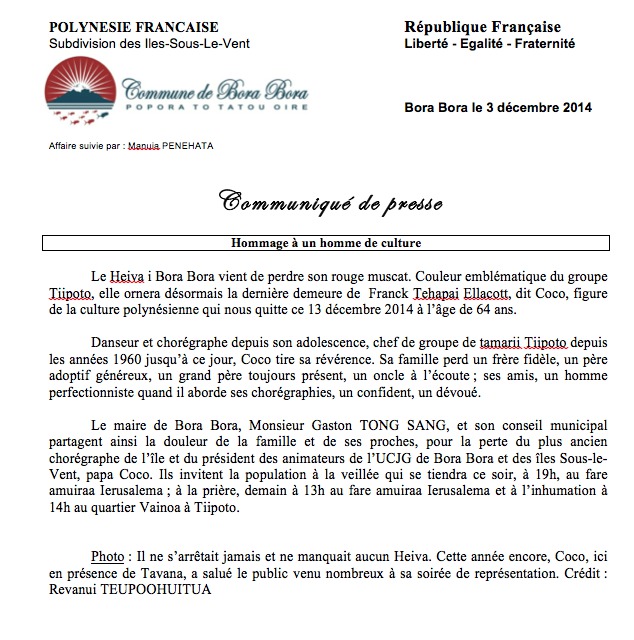 PAPEETE, le 4 décembre 2014. La Présidence de Polynésie a publié un communiqué de condoléances suite au décès de Coco Ellacott. "C’est avec regret que nous avons appris le décès hier de Mr Franck Tahapai Ellacott, dit Coco. Bora Bora et la Polynésie perdent un homme de culture, danseur et chorégraphe depuis son adolescence, chef de groupe de Tamarii Tiipoto depuis les années 1960, il ne manqua aucun Heiva de Bora Bora, et contribua à sa manière à perpétuer nos traditions et à transmettre à la jeunesse, avec précision et humanité, son savoir.