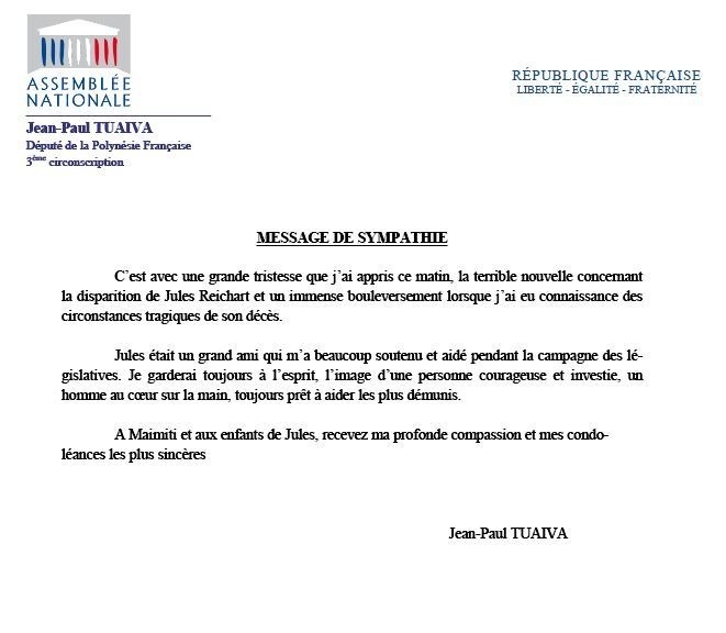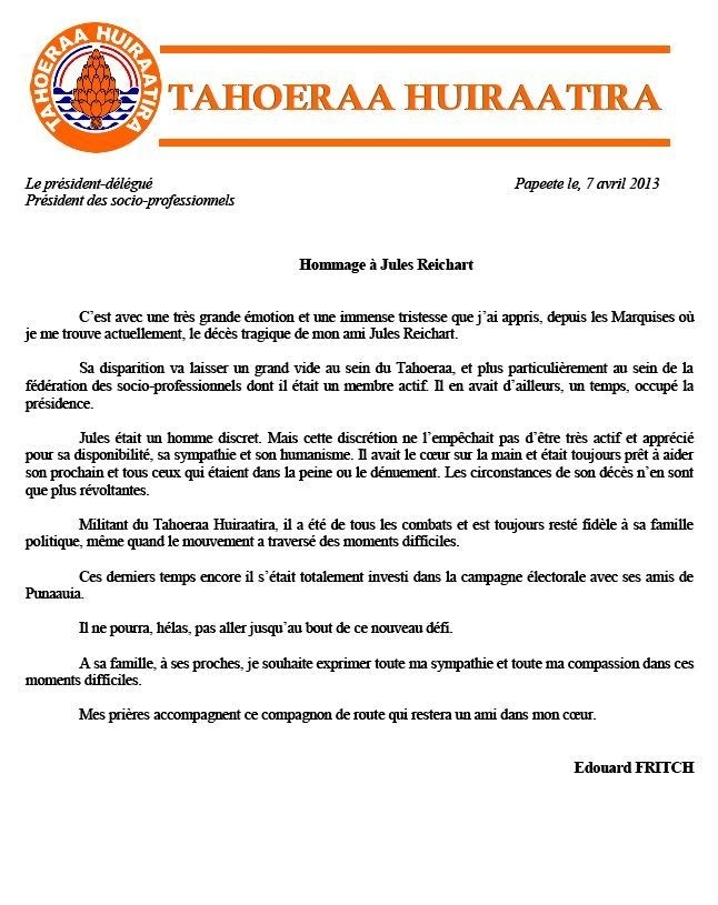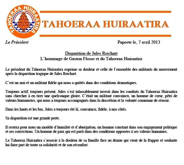 Jules Reichart, militant au sein du Tahoeraa Huiraatira a été victime d'une agression en rentrant chez lui samedi soir. Le parti de Gaston Flosse lui rend hommage