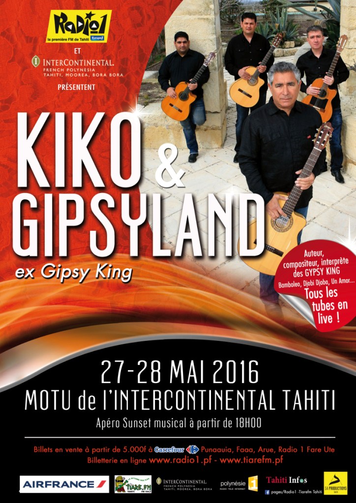 Après du rock 'n' roll avec le concert événement de Johnny Hallyday, Sonia Aline, la directrice de Radio 1, propose au public polynésien de la musique gitane avec Kiko & Gipsyland. Antoine "Kiko" Motos, à l'instar de Chico Bouchikhi, faisait partie du groupe mythique des Gipsy Kings, avant que la formation se sépare en 1987. "Je sors d’une famille où mon père, ma mère, mes oncles, mes tantes, tous savent chanter, jouer de la guitare et danser. Chez nous, c’était tous les jours la fête parce qu’on chantait tout le temps…", a confié dans une interview Kiko.