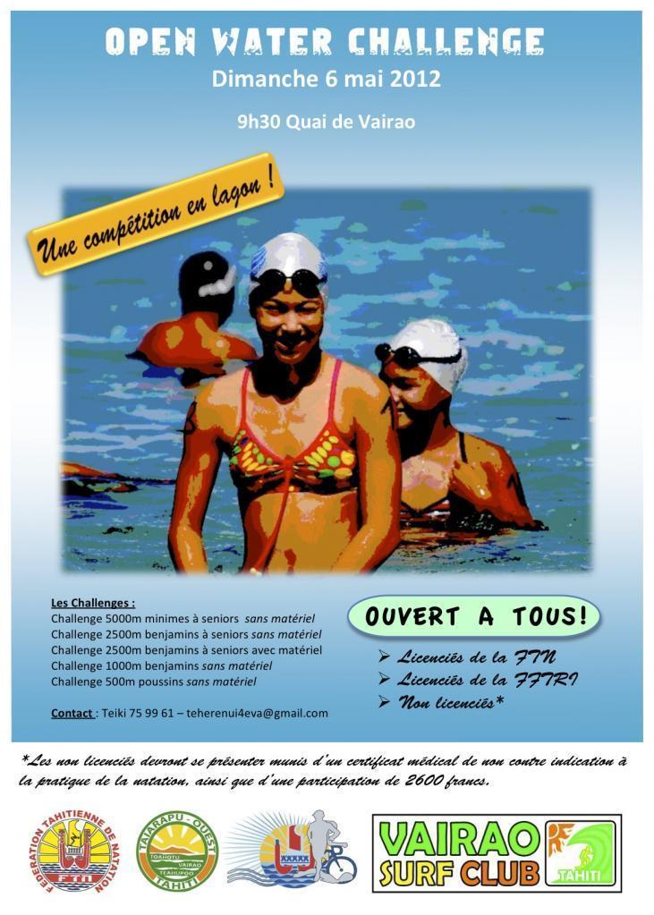La Fédération Tahitienne de Natation organise en partenariat avec la Commune de Vairao, l’association «Vairao Surf Club» et le soutien de la Fédération Tahitienne de Triathlon, la seconde étape de l’Open Water Challenge. Cette compétition se déroulera le dimanche 06 mai 2012 à Vairao, en face de la mairie à partir de 9h30.