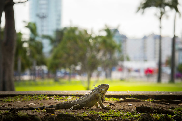 Équipés de sacs en toile et de cannes à pêche, ils traquent dans les arbres et les buissons des spécimens d'iguane rayé, un reptile qui prolifère depuis son introduction, dans les années 1960, sur l'île des Antilles.
