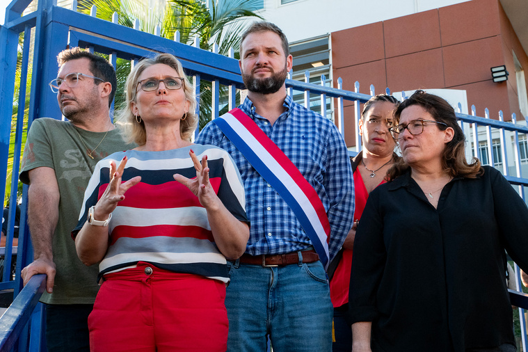 De gauche à droite, les élus du groupe Loyaliste Gil Brial, du groupe Rassemblement Virginie Ruffenach, le député de la 2e circonscription de Nouvelle-Calédonie Nicolas Metzdorf, Laura Vendegou du groupe Rassemblement et Sonia Backes du groupe Loyaliste.. Delphine Mayeur / AFP