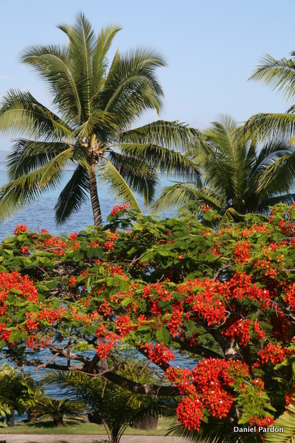 La floraison impressionnante d’un flamboyant, sur fond de cocotiers et de lagon.