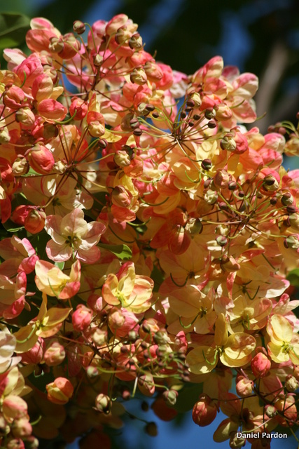 A partir de l’hybridation, à Hawaii, de Cassia javanica et de Cassia fistula, les cultivars de Cassia x nealii ont été multipliés, afin d’obtenir différentes nuances de coloration ; certains, comme celui-ci, produisent des grappes de fleurs d’un jaune très pâle, aussi fournies que celles mêlant le jaune et le rose.