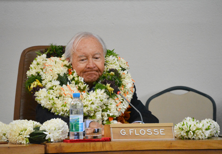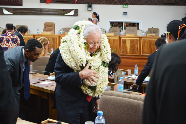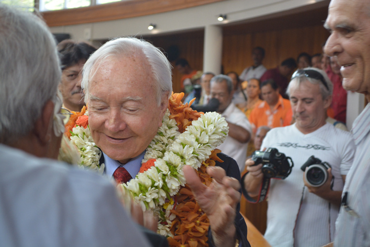 Gaston Flosse a rejoint la tribune du gouvernement recouvert de colliers de fleurs.