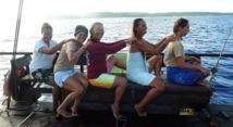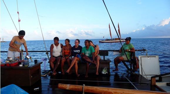 Dès le début, on nous a toutes réunies : 3 Fidjiennes, 4 Samoanes, la dernière est montée après la passe (rire), elle s’est débrouillée et finalement on s’est retrouvées à 17. Je précise qu’on a un bateau suiveur : Evohe, qui nous suit partout avec un médecin à bord… Donc il y avait 5 Samoanes, 3 Tahitiennes, 3 Fidjiennes, 2 Tongiennes, 1 Maori… Un équipage de 16 femmes, plus le capitaine Magnus. Sur Faafaite on a privilégié la coque des femmes. Le capitaine dort avec les femmes. Toutes les femmes dorment à gauche, c’est comme ça sur Faafaite. Sur Hine Moana, le Capitaine n’avait pas trop le choix. Normalement, la coque de tribord, c’est masculin. Il y a une coque mâle et une coque femelle.
