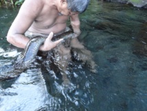 Joseph regrette de n’avoir pu aller au séminaire sur les anguilles à l’université, l’année dernière. Il n’avait pas de voiture. Il me dit aussi que l’émission Fare Ma’ohi en avait parlé et on sent dans sa voix la fascination pour ses compagnes d’eau douce. D’une trentaine en 2008, elles ne sont que 5 ou 6 aujourd’hui. « Elles sont faciles à pêcher. Il suffit de mettre un appât et elles viennent, comme elles ont faim. » Si je lui demande quel est son taura, son totem animal, il hausse les épaules et me dit : « Aucune idée ! », et il se met à rire. Ses enfants ont eux aussi plaisir à retrouver les anguilles sacrées.