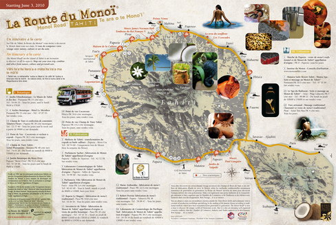 C'est sur l'initiative des producteurs de monoi regroupés au sein de l'Institut du monoi, et avec le soutien de la CCISM, et du service des métiers de Polynésie française que la route du monoi a été lancée. Ce parcours permettra au gré d'une promenade, d'aller à la rencontre d'une richesse, d'une culture...un voyage initiatique offert à tous ceux et celles qui souhaitent mieux connaître le Fenua. Les visiteurs reconnaîtront les étapes grâce à des panneaux plantés au bords des routes. Une carte trilingue tahitien, français anglais est disponible sur Tahiti dans les principaux points touristiques.
