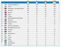Avant même la dernière journée de compétition, la Nouvelle-Calédonie est d’ores et déjà assurée de terminer en tête du tableau des médailles. Avec 269 podiums et 113 médailles d’or (100 argent, 56 bronze), les sportifs du Caillou ont laminé la concurrence. Tahiti devrait prend la seconde place (139 médailles : 58 or, 42 argent, 39 bronze) devant la Papouasie-Nouvelle-Guinée (118 médailles : 47 or, 24 argent, 47 bronze). Wallis-et-Futuna terminent à la 10e place avec deux titres en volley-ball masculin et en javelot handisport masculin (12 médailles dont 3 argent, 7 bronze).
