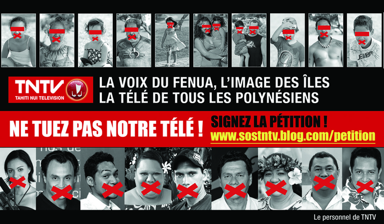 "La voix du Fenua, l'image des îles, la télé de tous les Polynésiens". C'est ce qu'on peut lire sur la publicité parue dans le quotidien "La Dépêche de Tahiti" ce mercredi 20 juillet. Une campagne financée en partie par les salariés de TNTV : chacun des 52 employés de la chaîne a donné 1 000 F pour aider le CE à payer cette publicité. En noir et rouge, elle montre des Polynésiens et des journalistes de la chaîne réduits au silence par une grosse croix rouge qui leur barre le visage.