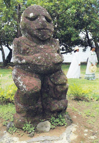 L’une des deux statues représentait une très grosse femme, avec un énorme ventre (3 m de tour) sur lequel sont posés des mains à six doigts, d’après Emile Vedel en 1933. Elle mesurait un peu plus de 2 m de hauteur, non compris un socle de 0,70 m, et son poids dépassait les deux tonnes. A peu près aussi grande et beaucoup plus mince, l’autre figurait probablement un homme, mais qui semblait avoir été émasculé depuis pas mal d’années. Les deux statues étaient taillées dans un seul bloc de tuffeau basaltique de couleur rouge foncé. Elles étaient plantées dans la brousse, faces au nord à quelques 600 mètres de la mer.