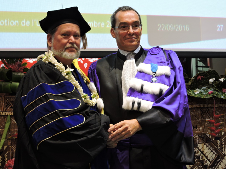 PAPEETE, le 23 septembre 2016. Le président de l'université de Polynésie française a remis jeudi à Patrick Kirch jeudi le titre de docteur honoris causa. Patrick Kirch est un grand spécialiste de l'archéologie du Pacifique.