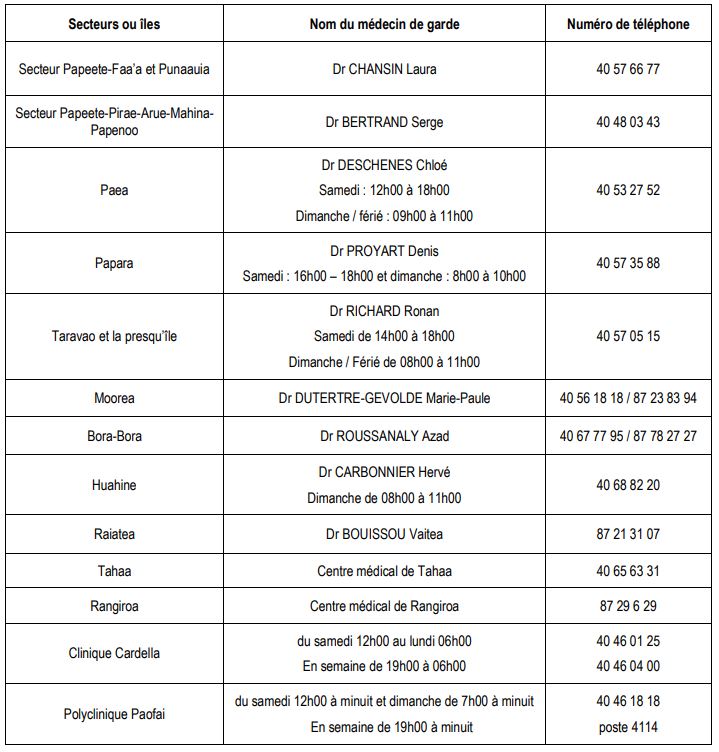 - Papeete : Pharmacie Cardella (Rue Anne-Marie Javouhey) Tél. 40 43 81 97