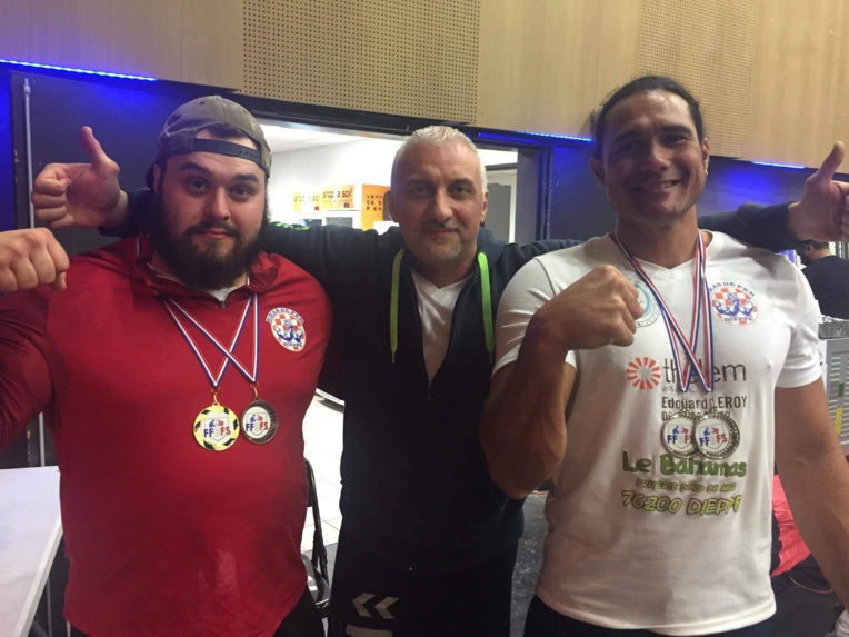 Tepa Teuru licencié au club de DIeppe (à droite) au côté de son coach David Mimoun (au centre) et de Kevin Butel (à gauche) l qui finit champion de France débutant bras droit.