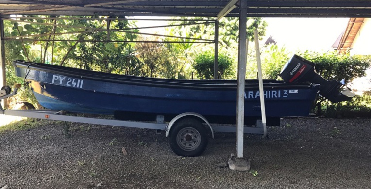 Ce bateau Shinju de 19 pieds avec son moteur et la remorque sera vendu aux enchères le mardi 28 août à la caserne de gendarmerie de Faa'a.