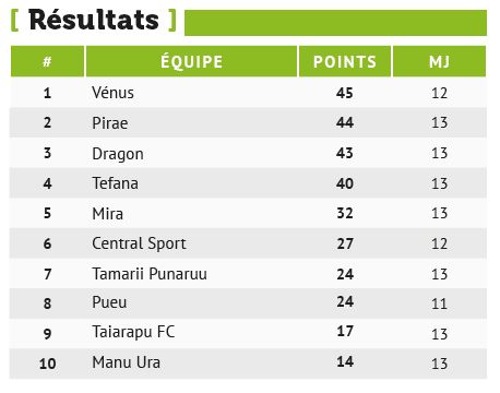 Avec cette onzième victoire en douze matchs, l’AS Vénus confirme son statut de favori et maintient un rythme intense en tête du classement. Derrière, l’AS Pirae s’accroche en remportant son match face à l’AS Tamarii Punaruu, 2 à 0, mais compte un match de plus. De leur côté, Tefana et Dragon ont remporté leur match (Pueu : 0 - Tefana : 4 et Dragon : 1 - Mira : 0) et sont toujours aussi solidement accrochés au wagon du haut de tableau.