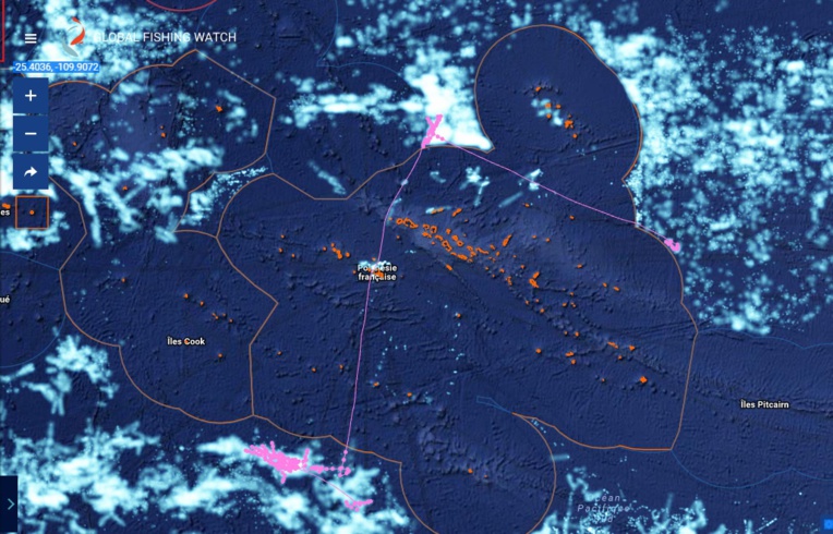 Sur cette carte, en rose, nous suivons le petit manège d'un bateau de pêche chinois entre aout et le 5 novembre 2017. Il commence sa pêche au sud des Australes, puis passe à Tahiti pour une escale avant de continuer sa campagne au nord des Tuamotu, avant de partir vers l'est de la ZEE. Mais ils n'ont jamais lâché leurs lignes dans nos eaux...