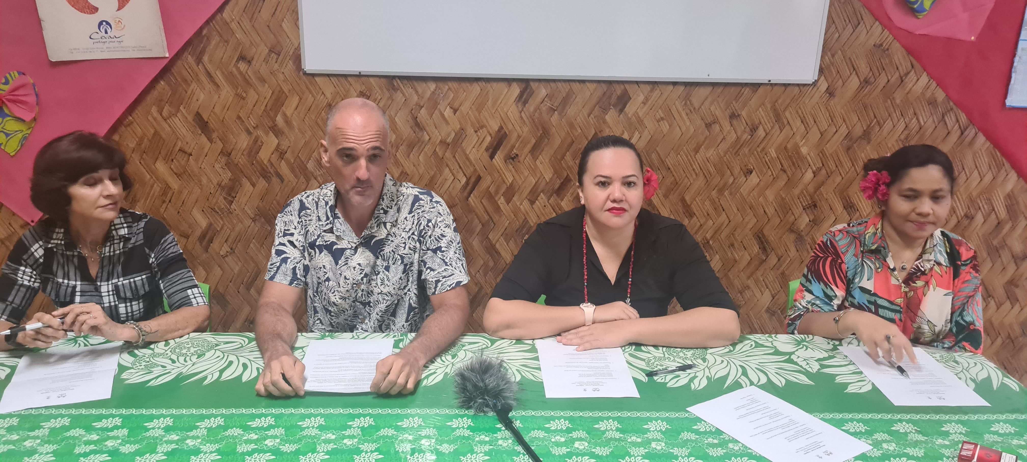 De gauche à droite : Danièle Castanet et Stéphane Darteyre, secrétaire adjointe et président du syndicat Liberté Santé Polynésie française, Lorna Oputu, vice présidente du syndicat des avocats de Polynésie française et Tiarenui Utia, traductrice.