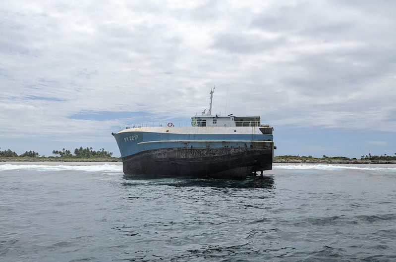 Tahiti, le 9 novembre 2022 - Deux jours après l'échouement du navire de pêche Tuarere sur le récif de Tikehau, des habitants de l'atoll ont constaté et photographié "un tapis de gazole sur une centaine de mètres autour du bateau".