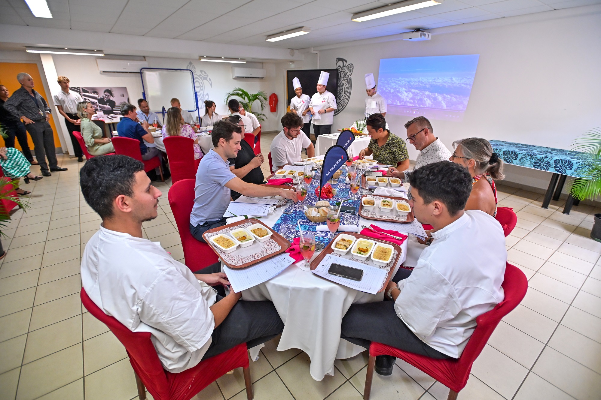 Depuis un an, un projet pédagogique original a permis de réunir la compagnie Air France, la société Newrest Polynésie et l’École hôtelière de Tahiti - Fare ha'api'ira'a hotera no Tahiti Te ParePare. L’objectif de ce projet : permettre aux élèves de BTS de cet établissement de réinterpréter les recettes présentées à bord de la compagnie nationale. Six recettes ont été proposées pour être revisitées par ces élèves.