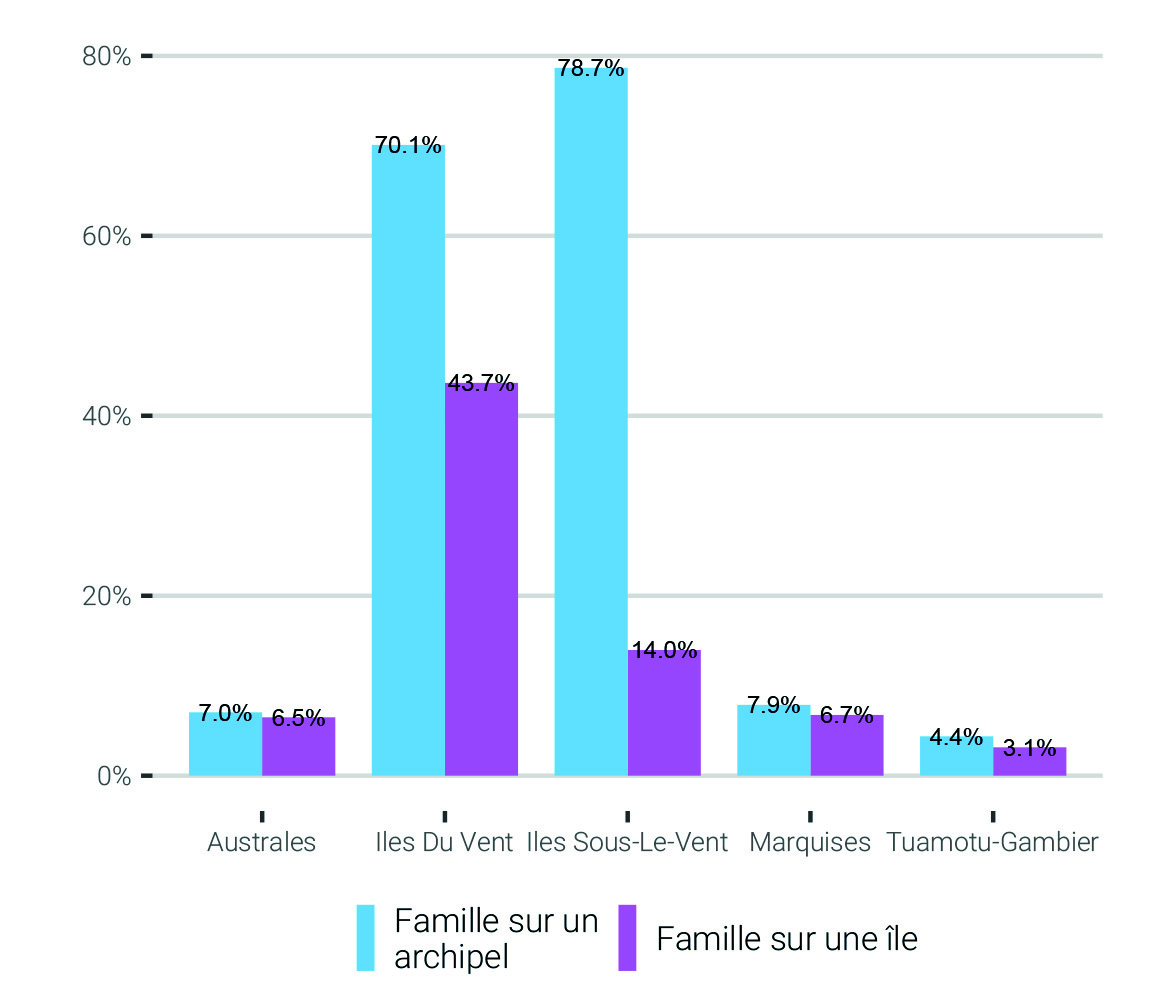 Toujours derrière le prisme du regroupement familial sur un archipel, l’étude Feti’i e fenua constate l’opposition entre les îles de la Société où résident globalement 71,3 % des familles et les autres territoires de la Polynésie. Il faut noter que c’est aussi dans cet archipel que réside 87,9 % de la population du territoire. Une donnée qui plaide en soi sur la forte attractivité de cet archipel.