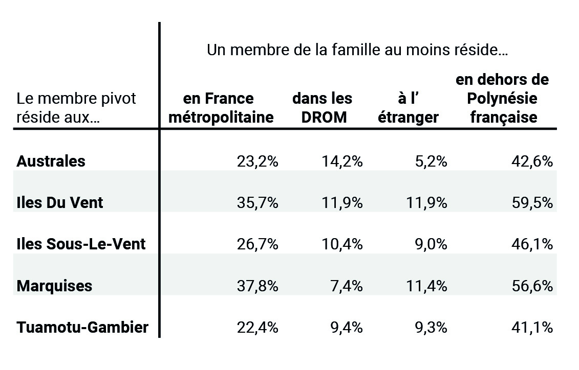 “En schématisant le réseau familial des enquêtés (âgés de 40 à 59 ans), on constate que les familles dont les pivots résident aux Tuamotu-Gambier se polarisent à 95,1% dans les îles de la Société, alors que 8,4 % et 8,2 % de leurs membres résident respectivement aux Australes et aux Marquises”, constate l’enquête. De même, 92 à 95 % des familles des couples pivots résidant aux Australes, aux Marquises ou aux Tuamotu-Gambier sont implantées dans les îles de la Société.