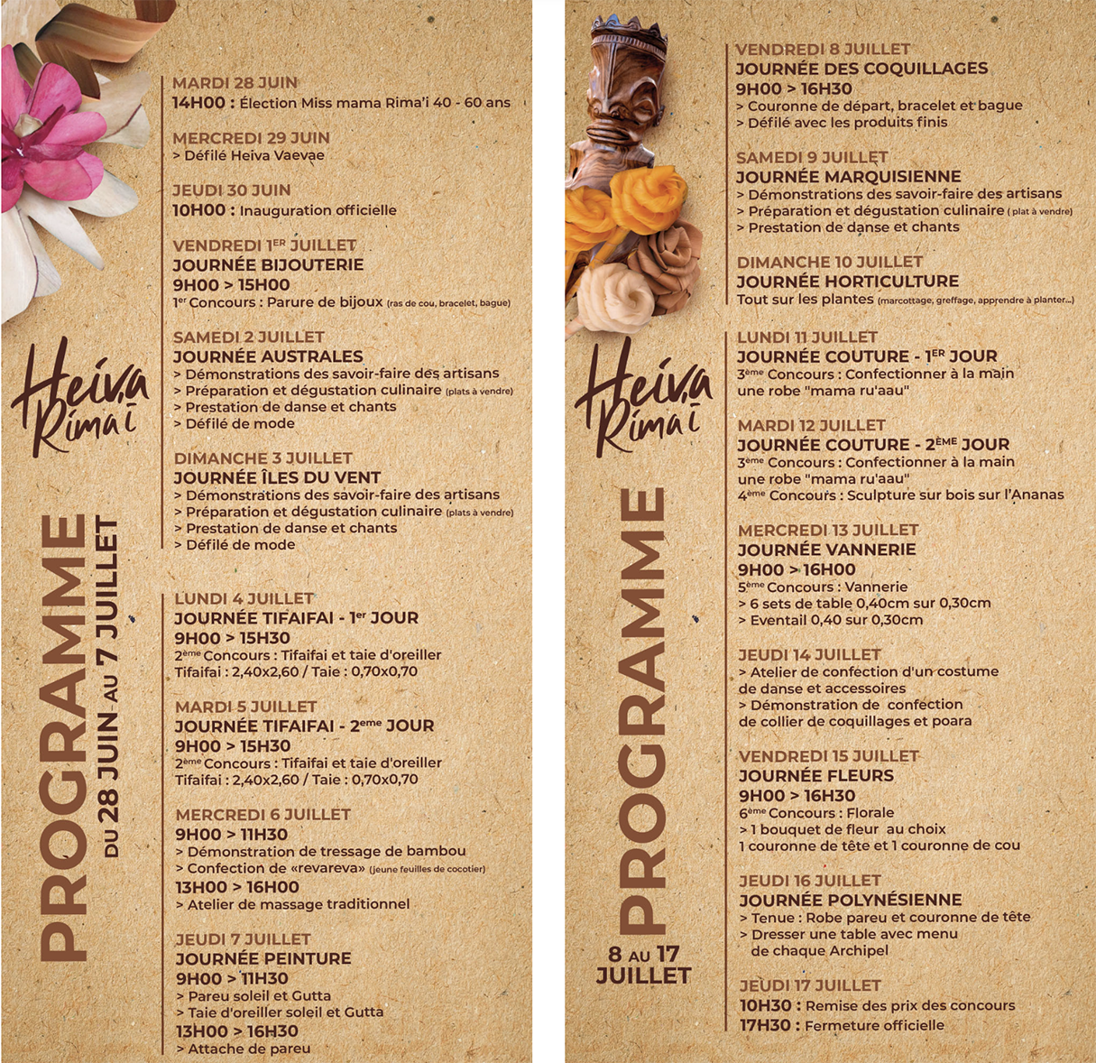 La 33e édition du Heiva rima’ī est officiellement ouverte depuis ce jeudi mati, au parc exposition de Mama’o où il se tient jusqu’au 17 juillet prochain sur le thème Te mau hotu o te fenua : Les merveilles de la terre. L’entrée est libre de 9 heures à 17 h 30. Ce salon regroupe des artisans des cinq archipels et toute la richesse et la diversité de l’artisanat traditionnel polynésien.