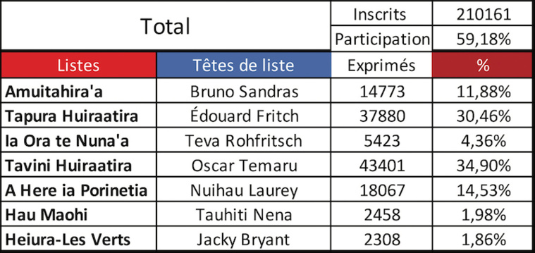 Enfin, il reste toujours difficile d'analyser les scores des listes les plus modestes de ces élections. Parti trop seul, le mouvement Ia Ora te Nuna'a de Teva Rohfritsch a raté une marche beaucoup trop haute en terminant à 4,36% et 5 423 voix. Le sénateur et ancien vice-président quitte l'assemblée de la Polynésie française pour les cinq prochaines années. Les deux listes Hau Maohi de Tauhiti Nena et Heiura-Les Verts de Jacky Bryant font jeu égal avec respectivement 2 458 voix (1,98%) et 2 308 voix (1,86%).