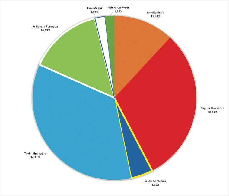 Tahiti, le 16 avril 2023 – Poursuivant une irrésistible progression enclenchée lors des élections législatives de 2022, le Tavini huiraatira a réussi le tour de force de se hisser en tête du premier tour des élections territoriales dès dimanche soir en surclassant de plus de 5 000 voix la majorité sortante du Tapura huiraatira. L'érosion de l'électorat du parti majoritaire se confirme partout, notamment à Tahiti et Moorea. A Here ia Porinetia confirme sa percée des dernières législatives et participera à la triangulaire du second tour. Tandis que le parti de Gaston Flosse disparaît de l'assemblée pour 800 petites voix.