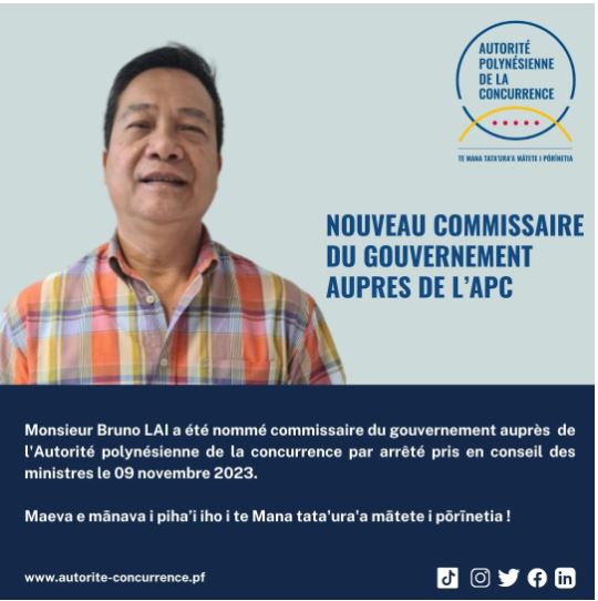 Tahiti le 23 novembre 2023. Le Pays a nommé son commissaire au gouvernement au sein de l'Autorité polynésienne de la concurrence.