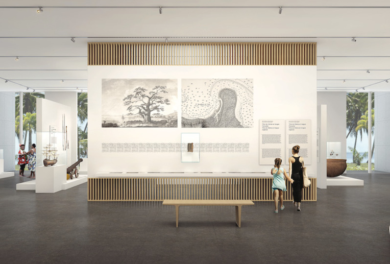 Le musée de Tahiti réserve un place de choix au maro'ura, comme on le voit ici sur une image 3D, un mur d'exposition central lui sera consacré. La réouverture est prévue en 2022. (©Musée de Tahiti et des îles)