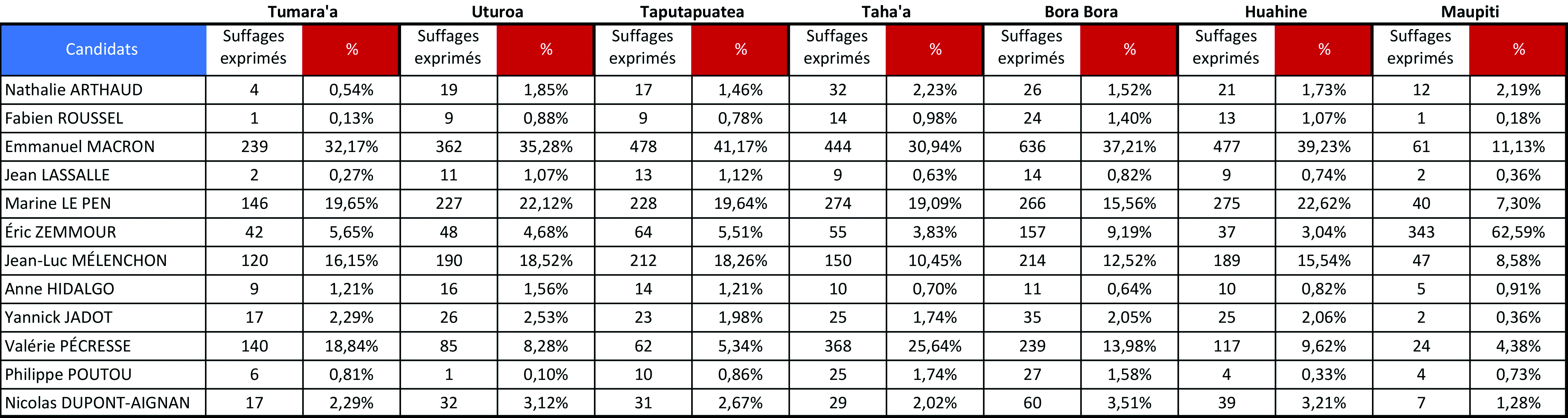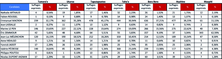Tahiti, le 10 avril 2022 – Plus d’un vote sur trois (34,4%) s’est exprimé en faveur du candidat Emmanuel Macron, dans l’archipel des îles Sous-le-Vent, samedi. L’île de Maupiti se distingue avec un vote Eric Zemmour à 62,6%.