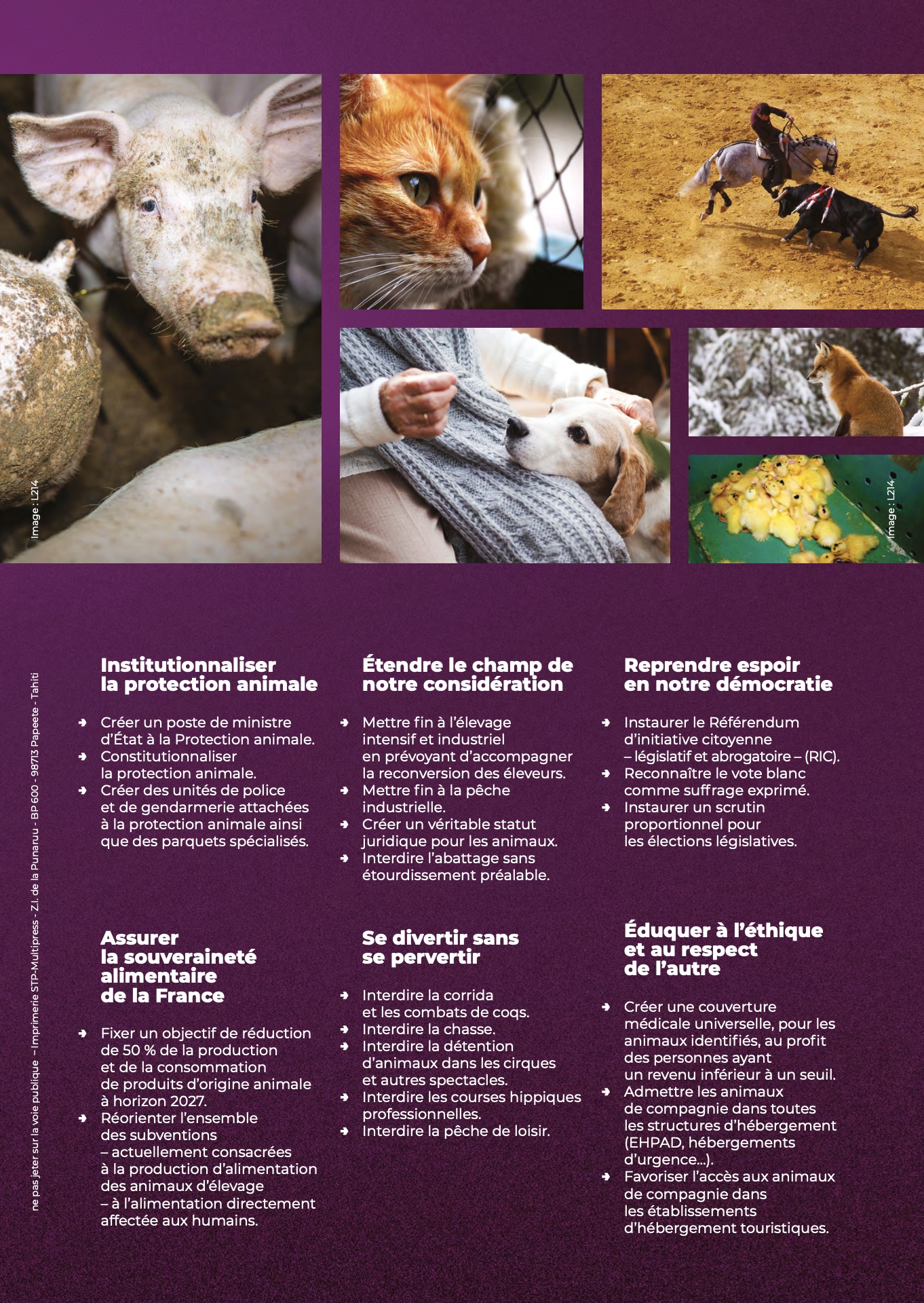 Plus précisément, le parti animaliste a développé un plan d'action en six points pour ces élections. Il propose notamment d'institutionnaliser la protection animale, avec entre autres la création d'un poste de ministre d'État à la protection animale, ou avec la "constitutionnalisation" de la protection animale. Mais le programme promeut aussi la "souveraineté alimentaire" en réduisant de 50% la production et la consommation de produits d'origine animale d'ici 2027. Le Parti animaliste entend par ailleurs créer un "véritable statut juridique pour les animaux", ou encore interdire des pratiques comme la corrida, le combat de coqs, la chasse, la détention d'animaux dans les cirques, les courses hippiques ou la pêche de loisir. Plus ambitieux encore, le programme propose la création d'une couverture médicale universelle pour les animaux, au profit des personnes ayant un revenu inférieur à un seuil.