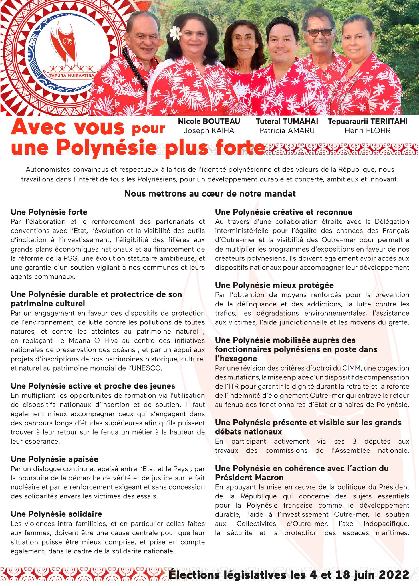 Comme ses collègues du Tapura, Nicole Bouteau défend à la fois une "Polynésie en cohérence avec l'action du Président Macron" -notamment sur le développement durable, l'aide à l'investissement outre-mer, l'axe Indopacifique, la sécurité et la protection des espaces maritimes- tout en revendiquant le respect d'une "identité polynésienne et des valeurs de la Républiques". A ce titre, les trois candidats du parti d'Édouard Fritch ne cachent pas plaider pour l'instauration d'une "citoyenneté" polynésienne, qui s'avèrera d'ores et déjà délicate à négocier avec Paris. Révision des critères d'octroi du CIMM, cogestion des mutations, compensation de l'ITR et "refonte de l'indemnité d'éloignement Outre-mer qui entrave le retour au fenua des fonctionnaires d'État originaires de Polynésie" font à ce titre partie intégrante du programme du Tapura pour ces législatives.