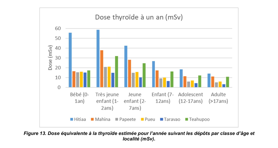 Les conclusions du rapport, assorties de nombreux tableaux et graphiques détaillés, sont les suivantes : “Les doses efficaces ainsi calculées pour les douze mois qui ont suivi les retombées radioactives de l’essai Centaure varient de 0,4 mSv pour des adolescents ou des adultes résidant à Taravao, à 5,6 mSv pour des enfants de 1 à 2 ans résidant à Hitiaa. De manière générale, les doses les plus faibles sont celles estimées pour les adultes et les doses les plus élevées sont celles estimées pour les très jeunes enfants. Pour toutes les classes d’âge, les doses efficaces les plus élevées sont estimées là où les dépôts radioactifs les plus importants ont été mesurés – Hitiaa et Teahupoo/plateau de Taravao. À l’inverse, les doses les plus faibles concernent les zones où les dépôts ont été les plus faibles – Papeete et Taravao. Les doses à la thyroïde varient entre 3 mSv et 59 mSv en suivant les mêmes logiques d’analyse liées aux classes d’âge et aux lieux de résidence”. Les voies d’expositions prédominantes sont l’ingestion et l’exposition externe. Les doses efficaces et les doses équivalentes à la thyroïde résultent principalement de l’incorporation d’iode 131 via la consommation de légumes et de lait (à plus de 80% pour les doses équivalentes à la thyroïde).