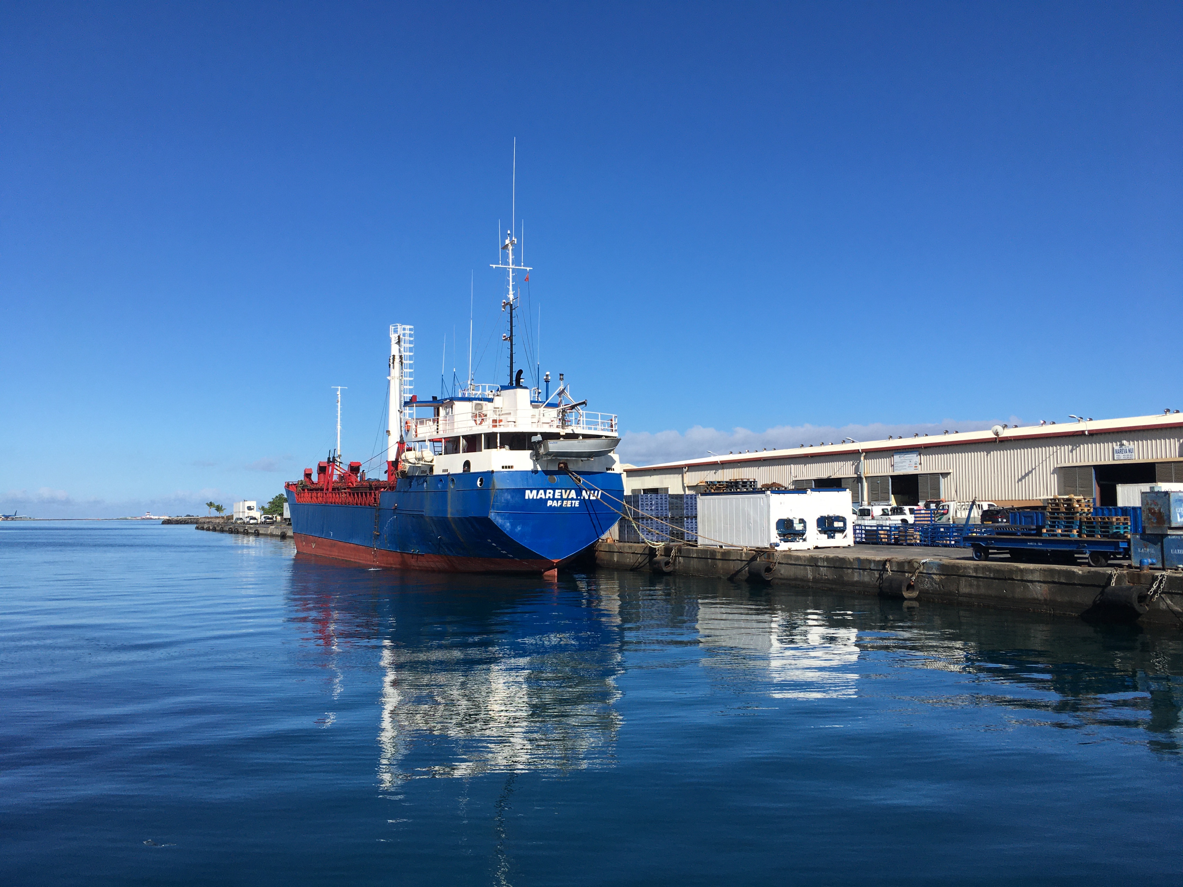 "Aujourd’hui : galère !", soupire Viriamu Fougerouse. Le directeur d’exploitation du Mareva Nui est tout occupé au prochain départ du caboteur, prévu de Motu Uta ce lundi. Comme chaque quinzaine, ce cargo de 60 mètres doit effectuer le transport de marchandises sur sa route habituelle de Ahe à Makemo, avec des arrêts à Tikehau, Rangiroa, Manihi, Fakarava. 16 atolls, 900 tonnes embarquées. Une artère de communication entre Papeete et les Tuamotu de l’ouest et du centre. Mais, comme ailleurs, la crise Covid a tapé aveuglément dans les équipages. Avec trois cadres en arrêt actuellement, garantir le départ de lundi n’est pas gagné. "On se débrouille quand même", rassure optimiste et un brin taiseux Viriamu. A quai, le navire est en cours de chargement. Il partira.