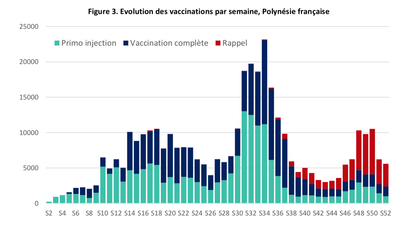 Sur le front de la vaccination, le dernier bulletin épidémiologique recense 173 859 personnes avaient reçu au moins une dose de vaccin, soit plus de trois-quarts de la population éligible de Polynésie française. Un schéma vaccinal de deux doses a été reçu chez 58,2% de la population totale et 13,6% a reçu une dose de rappel. Plus précisément, cette couverture vaccinale avec un schéma à deux doses atteint 71,3% parmi la population éligible (12 ans et plus), et 75% chez les plus de 18 ans.