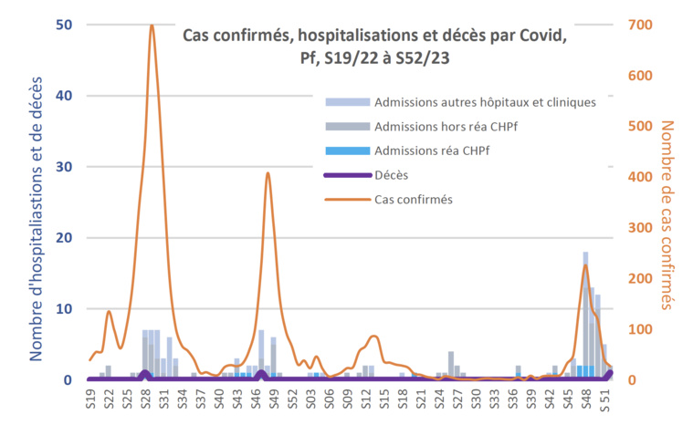 Le nombre de nouvelles hospitalisations est en diminution en S52, avec seulement deux personnes hospitalisées. Aucun passage en réanimation n’a été déclaré. Aucun cas n’a été rapporté aux Australes et aux Marquises.