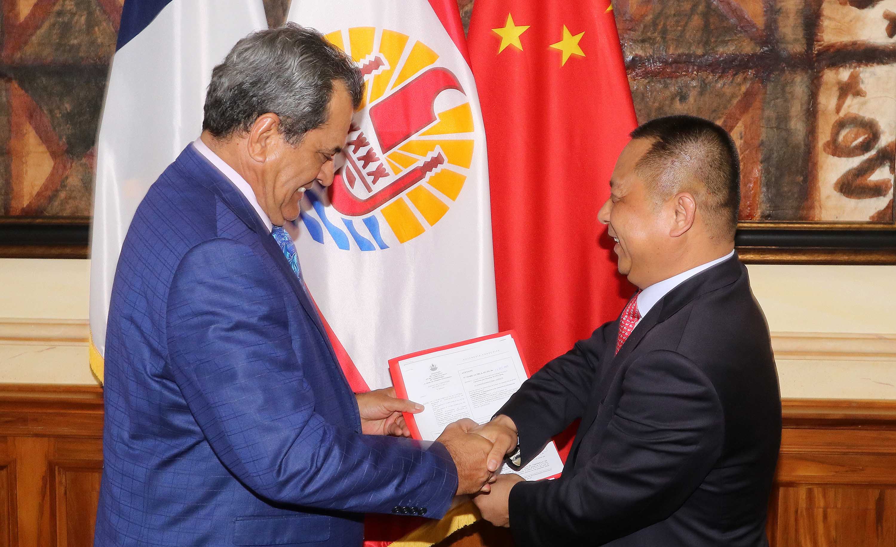 Le président de la Polynésie française, Edouard Fritch, et Wang Cheng, président de la hongkongaise porteuse du projet de ferme aquacole de Hao, ce jeudi à Papeete.
