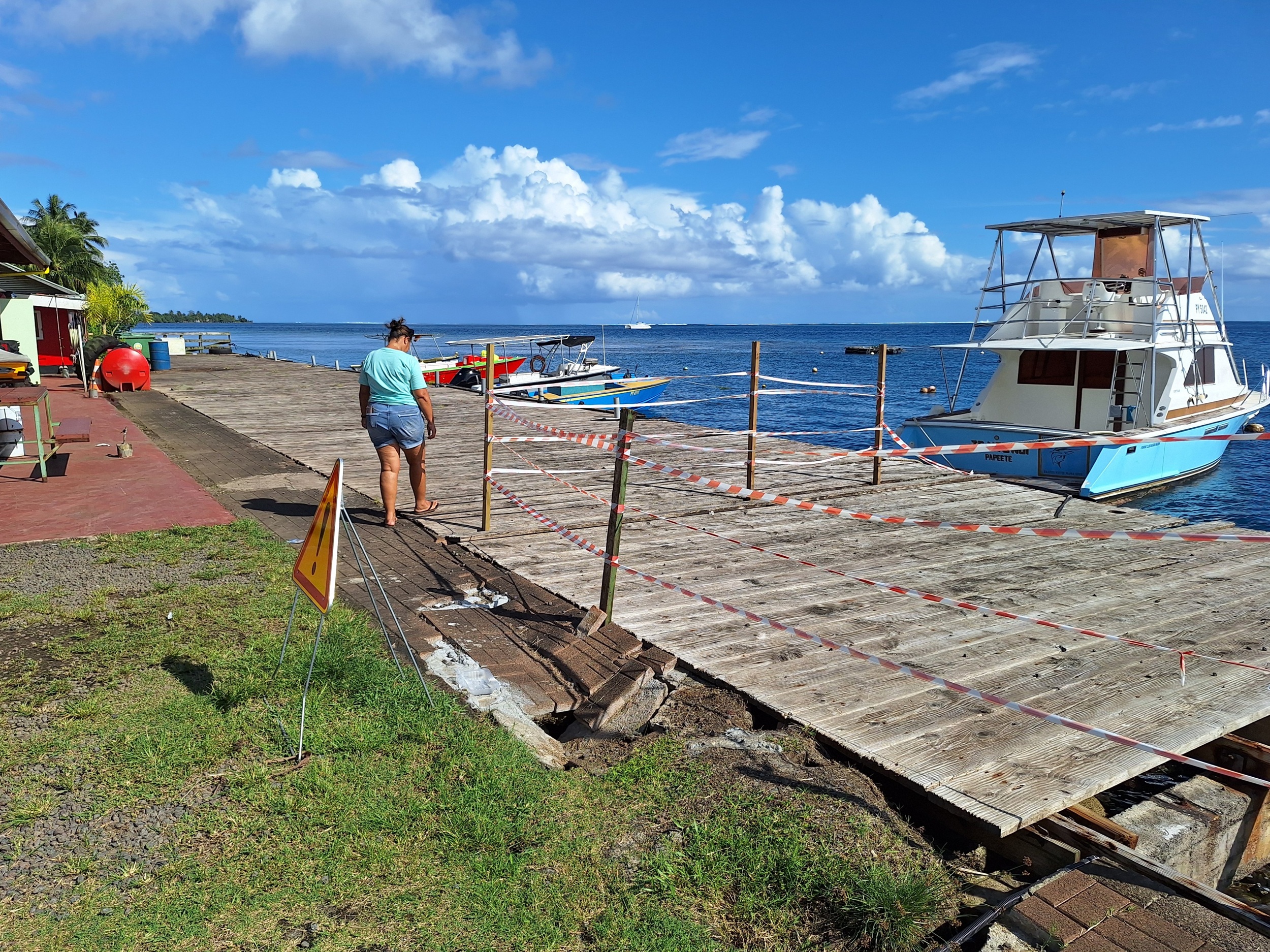 “Ça va faire deux ans que le quai est en mauvais état. Les bois ont été abîmés par la houle et l’usure du temps. Dans mes souvenirs, il n’a pas été refait depuis 2008. Il y a des trous un peu partout et des zones ont été condamnées aux deux extrémités”, constate Varink Tama, trésorière de la coopérative des pêcheurs de Vairao, également vice-présidente de la Chambre d’agriculture et de la pêche lagonaire (CAPL) et du comité du tourisme de Taiarapu-Ouest.
