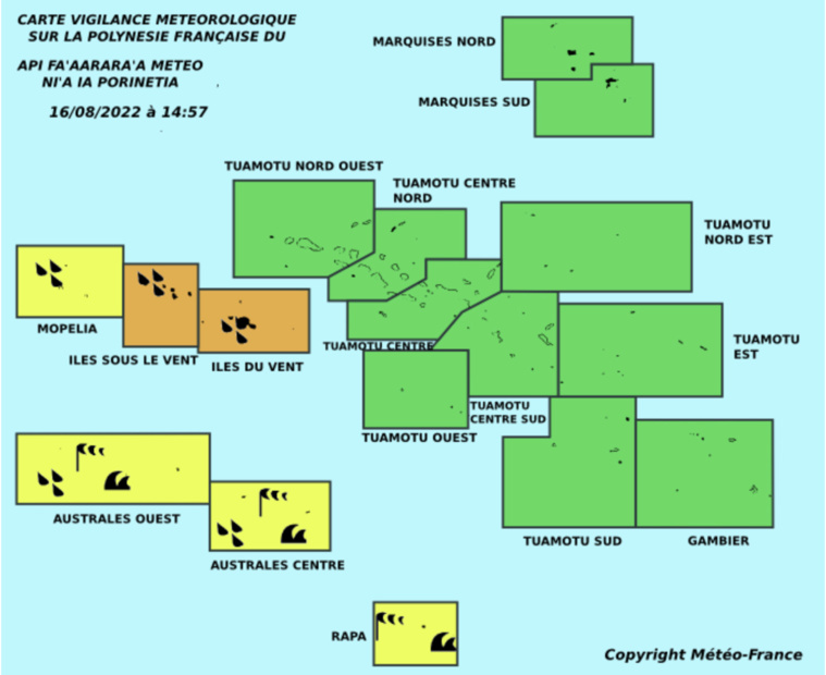 Tahiti, le 16 août 2022 – Les îles de l’archipel de la Société sont en vigilance orange pour fortes pluies. Météo-France ne prévoit pas d’accalmie notable avant mercredi soir.
