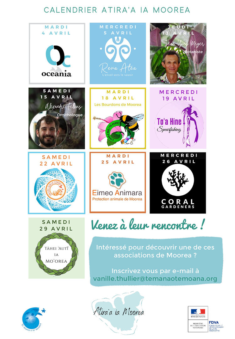 L’association Te Mana o te Moana met en place durant, en avril et mai, le projet Atira’a ia Moorea. Des associations locales ou des experts doivent y partager avec le public, durant des journées de formation gratuite, leurs connaissances dans les domaines culturels, environnementaux, scientifiques ou sociaux. Les bénévoles du tissu associatifs sont particulièrement visés. Au programme des journées déjà mise en place, les personnes présentes ont par exemple eu l’opportunité de mieux connaître les oiseaux avec l’ornithologue Alexandre Fellous, ou sur les plantes avec le botaniste Jean-Yves. Des associations comme Te Mana o te Moana, qui se consacre à la protection des tortues de mer, ou comme l’association pour la protection de l’environnement Les Bourdons de Moorea ont également animé des présentations de leur domaines d’actions.
