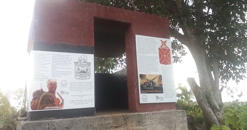 Après l’installation en septembre dernier d’une fresque de dix mètres au restaurant Beach Club à Matira, cette association achève la restauration du site de défense installé par les Bobcats sur les hauteurs de la pointe Fitiu à Ha’amaire. Le site historique a été nettoyé par ses propriétaires. Les deux pièces d’artillerie ont été débarrassées de leurs graffitis et le poste de tir a été repeint. À l’initiative de l’association Mémoire polynésienne, cinq panneaux d’informations historiques ont été posés. Leurs textes en langue tahitienne, française et anglaise renseignent désormais les visiteurs sur les conditions d’installation de ces deux pièces d’artillerie côtières et leurs servants. L’illustration centrale est l’œuvre du regretté Jean-Louis Saquet, graphiste de renom et les ressources documentaires et iconographiques issues des fonds du président de l’association Mémoire polynésienne.