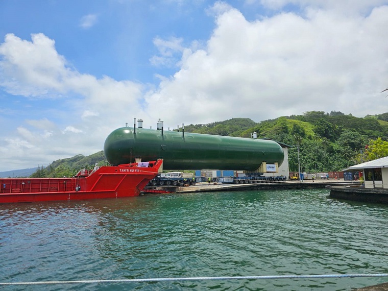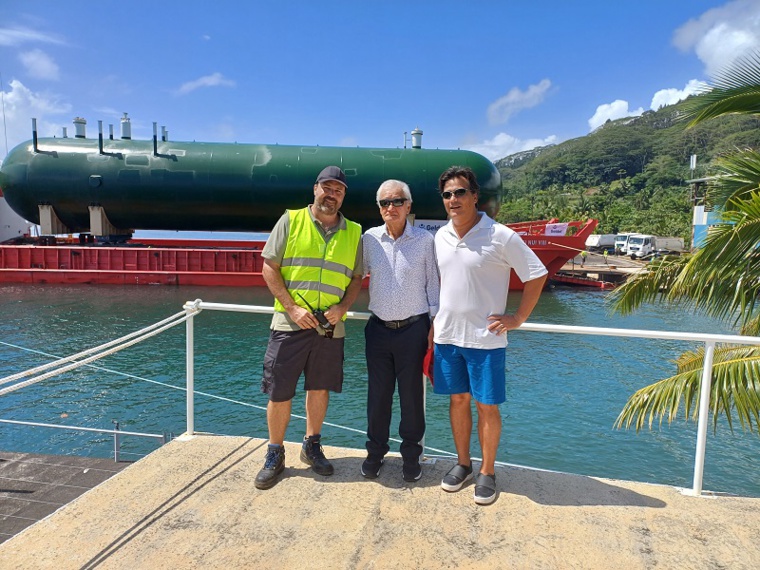 Tel que l'a ensuite expliqué le directeur général du projet, Sébastien Millot, lors du déchargement minutieux de la première cuve, “cela fait plus de deux ans que nous préparons cette opération de débarquement des trois cuves sur Hitia'a. C'est une opération que nous avons réalisée avec des partenaires – Geldof, Sarens et Aza France – et c'est l'aboutissement d'un travail d'équipe. Le procédé de débarquement est très cadré avec des procédures qui sont validées de tous et la fenêtre météo nous permet de travailler en sécurité. L'objectif est d'avoir des cuves déposées au fond de la vallée à la fin du week-end.” Interrogé sur la technicité d'une telle opération, Sébastien Millot a lui aussi évoqué une “prouesse technique car ce sont des charges de plus de 400 tonnes qu'il faut débarquer et faire rouler”. “Néanmoins, ce sont des opérations qui sont classiques dans le domaine de la manutention des charges lourdes, c’est-à-dire que les équipes avec lesquelles nous travaillons sont des spécialistes reconnus dans ce domaine et nous nous sommes réciproquement fait confiance dans ce projet.”
